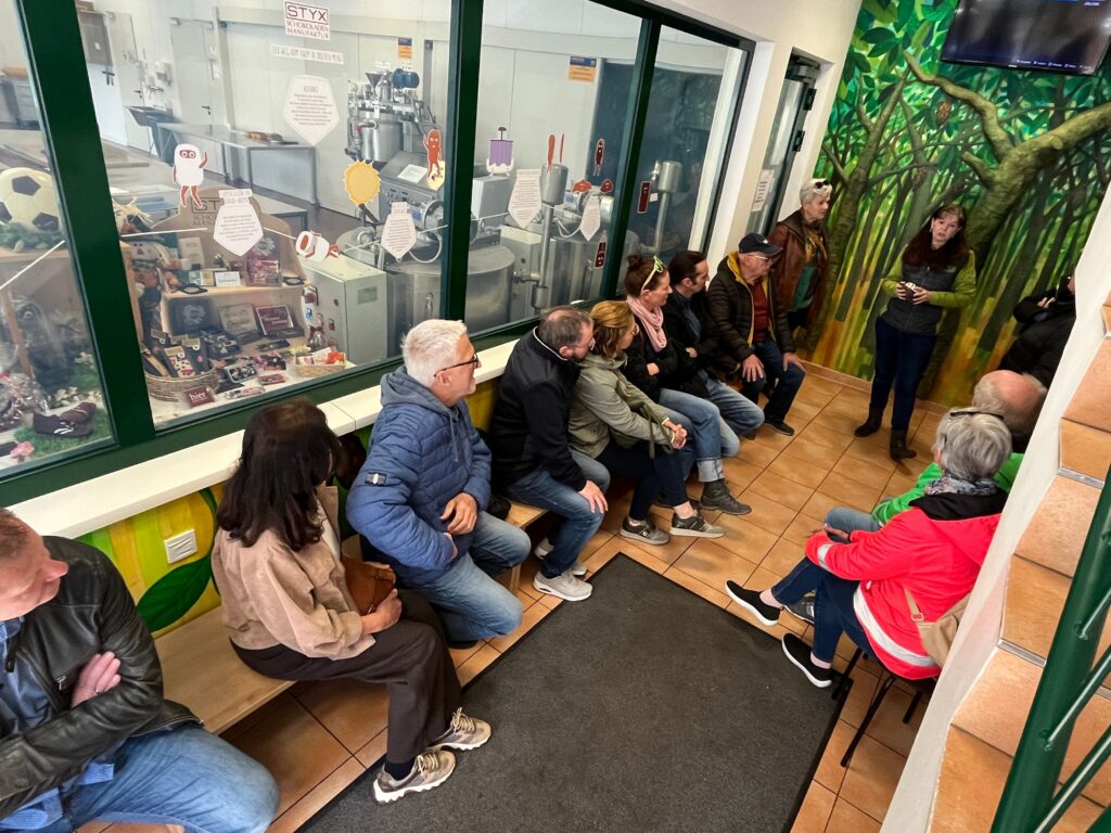Nach der spannenden Führung mit zwei Reiseleiterinnen durch den Kinoraum, Museumsbereich und die weitläufigen Produktionsräumlichkeiten von STYX, wurde die strenge Philosophie des Unternehmens nur hochwertige (Bio-)Materialien und spezielle Verfahren der Gewinnung von Pflanzen-Rohstoffen für die Endprodukte zu verwenden, präsentiert. Ebenso konnten die Besucher die einst besonders aufwändigen Methoden zB. bei der Rosenöl-Gewinnung kennenlernen. Schließlich durfte die Reisegruppe die herrlichen, hauseigenen Schokoladen sowie das selbst gebraute Bier verkosten.